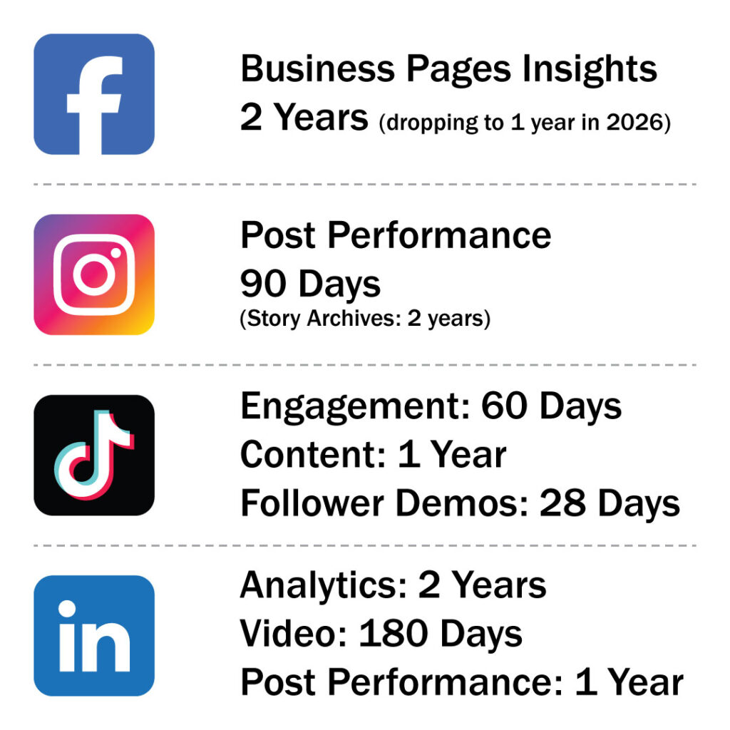 Here’s a breakdown of how long different social platforms keep marketing performance data.