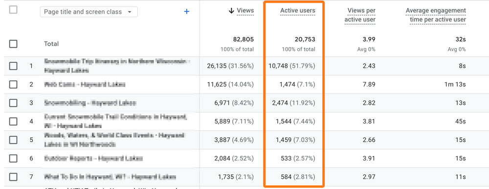 Pages and Screens is a report that shows which specific web pages site users are visiting. It helps you identify your most popular content and where users might be losing interest. Data displayed will show you the number of actual page views, the number of active users, and the average amount of engaged time spent on the page.